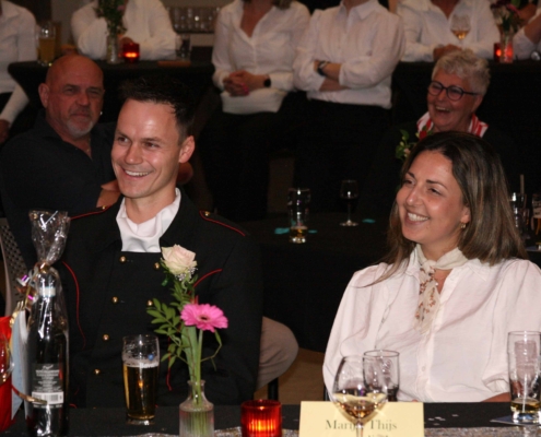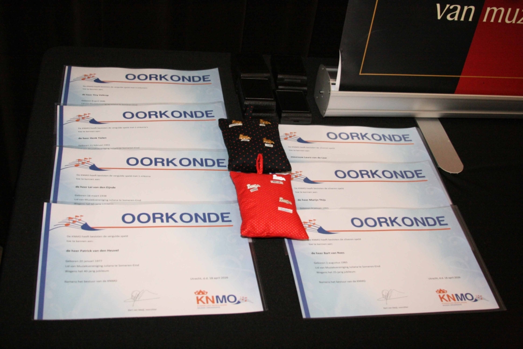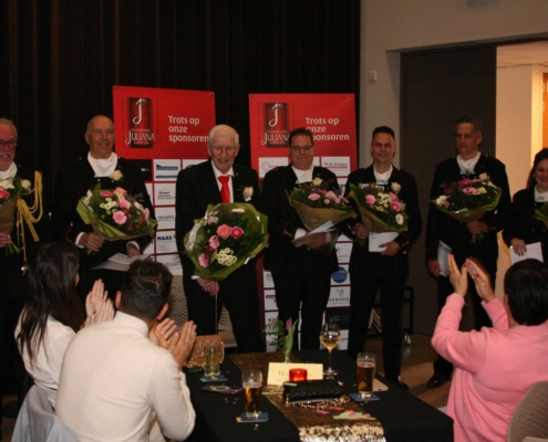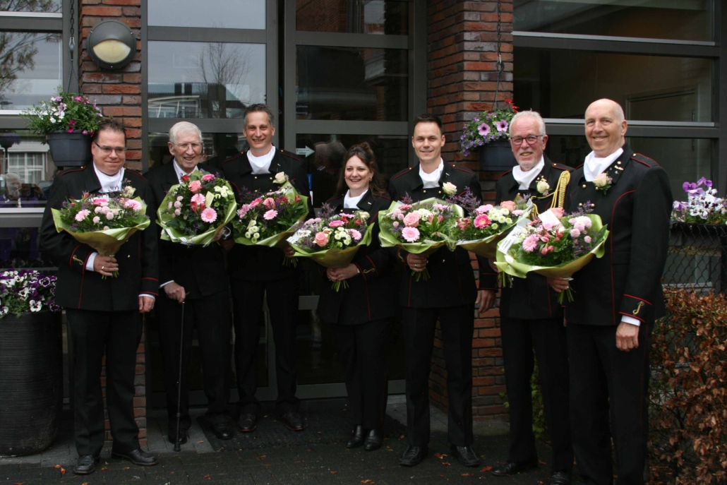 Marijn Thijs, Laura van de Laar en Bart van Rees waren 25 jaar lid. Patrick van den Heuvel en Lei van den Eijnde respectievelijk 40 en 50 jaar. Henk Tielen mocht zijn 60-jarig lidmaatschap vieren en Tiny Veltrop was maar liefst 70 jaar lid van de Muziekvereniging!